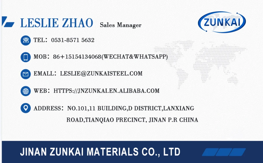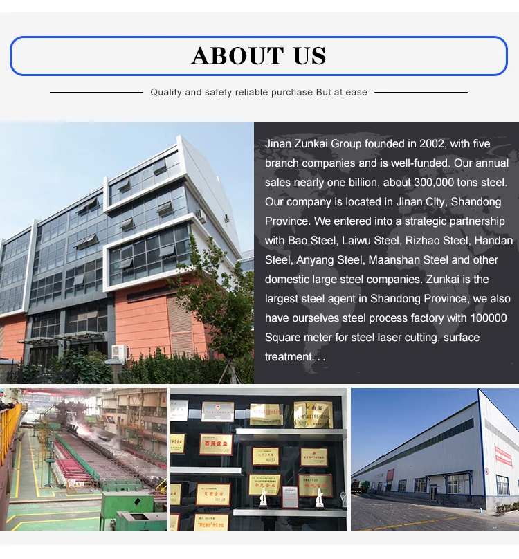 Jinan Zunkai Group founded in 2002, with five branch companies and is well-funded. Our annual sales nearly one billion, about 300,000 tons steel. Our company is located in Jinan City, Shandong Province. We entered into a strategic partnership with Bao Steel, Laiwu Steel, Rizhao Steel, Handan Steel, Anyang Steel, Maanshan Steel and other domestic large steel companies. Zunkai is the largest steel agent in Shandong Province, we also have ourselves steel process factory with 100000 Square meter for steel laser cutting, surface treatment and other further processing , and our stock always more than 20,000 tons.Zunkai Group mainly engaged in : PPGI ,galvanized steel , steel plate , round bar, steel pipe ,Stainless steel product ,angle bar, steel pile ,H beam ,I beam, angle, Channel flat steel etc . Our good quality and reliable service will be your best trusted partner. Sincerely wish to building long and regular business with you forever...